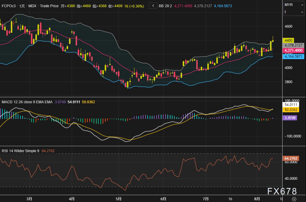 Pepperstone激石——周二(8月12日),马来西亚衍生品交易所(BMD)棕榈油主力合约(FCPOc3)今日延续反弹,10月合约收盘上涨16林吉特(0.36%),报4400林吉特/吨,连续第三个交易日收高。技术指标显示,日线级别MACD维持金叉但柱状收窄,RSI(14)位于64.27的中性偏强区域,布林通道上轨4378林吉特构成短期压力。盘面走强主要受中国大连商品交易所油脂期货提振——当日连盘棕榈油主力合约大涨3.13%,豆油合约跟涨0.9%,而芝加哥期货交易所(CBOT)豆油则下跌0.81%,内外盘分化凸显区域供需差异。
