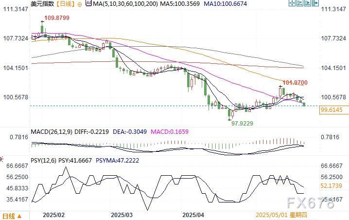 美元指数日线图 来源:易汇通北京时间5月21日15:01 美元指数 报 99.6145/6268
