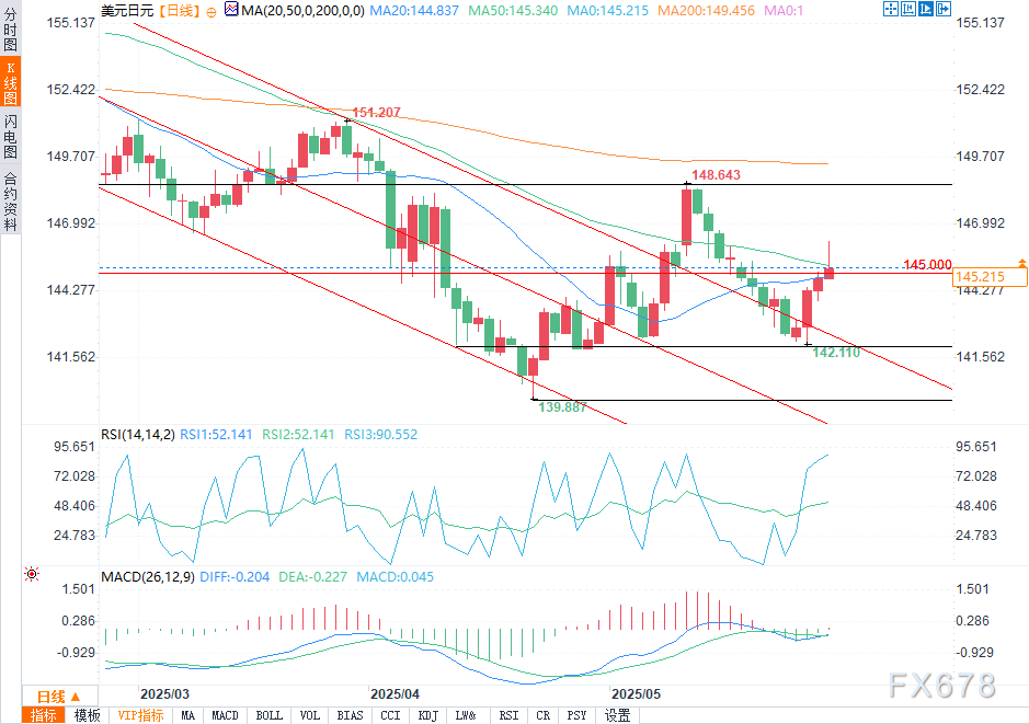 买家将寻求将上涨势头扩大至146.00上方,目标指向5月高点148.65。若突破该点位,将创下更高的高点,使200日移动平均线149.45的阻力位暴露出来。