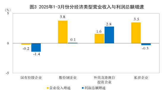 1—3月份,规模以上工业企业中,国有控股企业实现利润总额5599.5亿元,同比下降1.4%;股份制企业实现利润总额11101.5亿元,增长0.1%;外商及港澳台投资企业实现利润总额3883.5亿元,增长2.8%;私营企业实现利润总额3709.7亿元,下降0.3%。