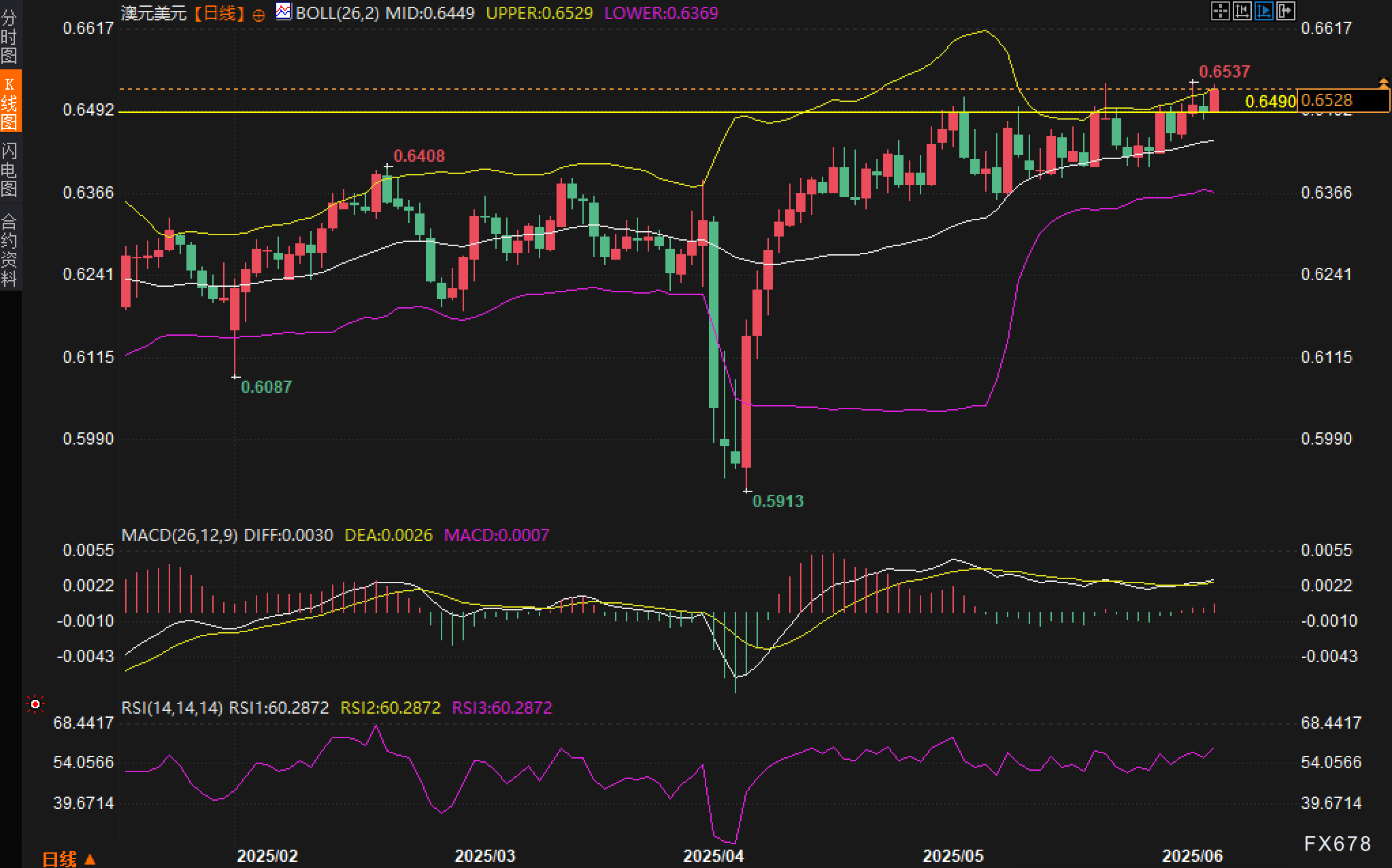 从日线图观察,澳元/美元维持在上升通道中运行,近几个交易日稳步推高,并成功突破前期重要高点0.6490的阻力位。最近交投于布林带上轨附近,表明汇价处于强势通道上缘,短期动能仍然旺盛。技术指标方面,MACD线与信号线维持金叉状态,柱状图红柱持续增长,预示多头动能未减。RSI指标运行在60上方,未出现超买,仍有上升空间。