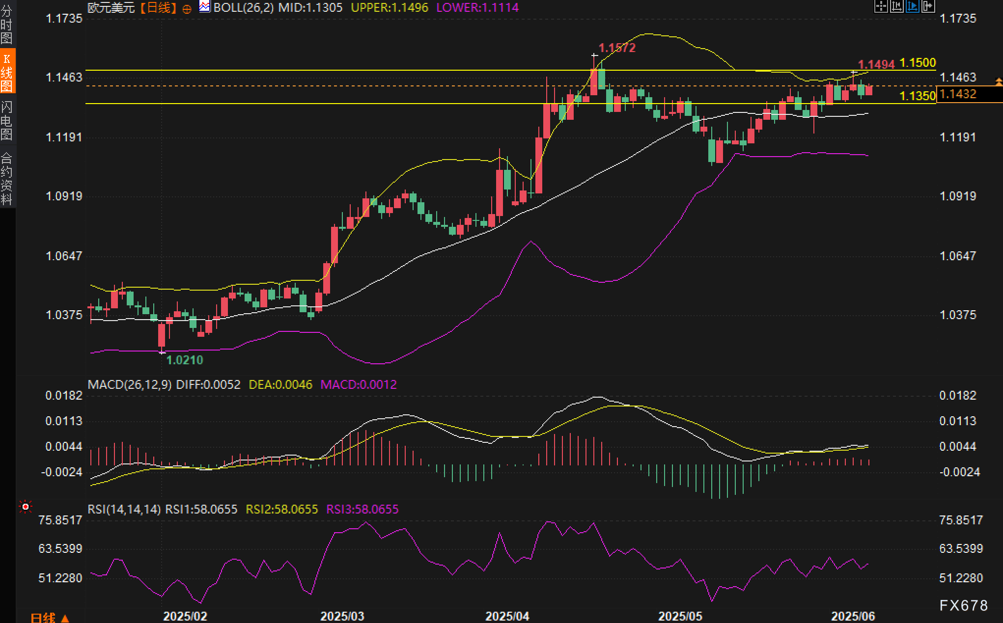 当前日线图显示,欧元兑美元正运行于布林带中轨之上,整体处于上升趋势整理阶段?;慵圩愿叩慊氐骱?目前重回1.143附近,显示短线修复动能尚存。技术上,布林带中轨位于1.1305附近,已形成第一支撑,而上轨压制则集中在1.1496附近。