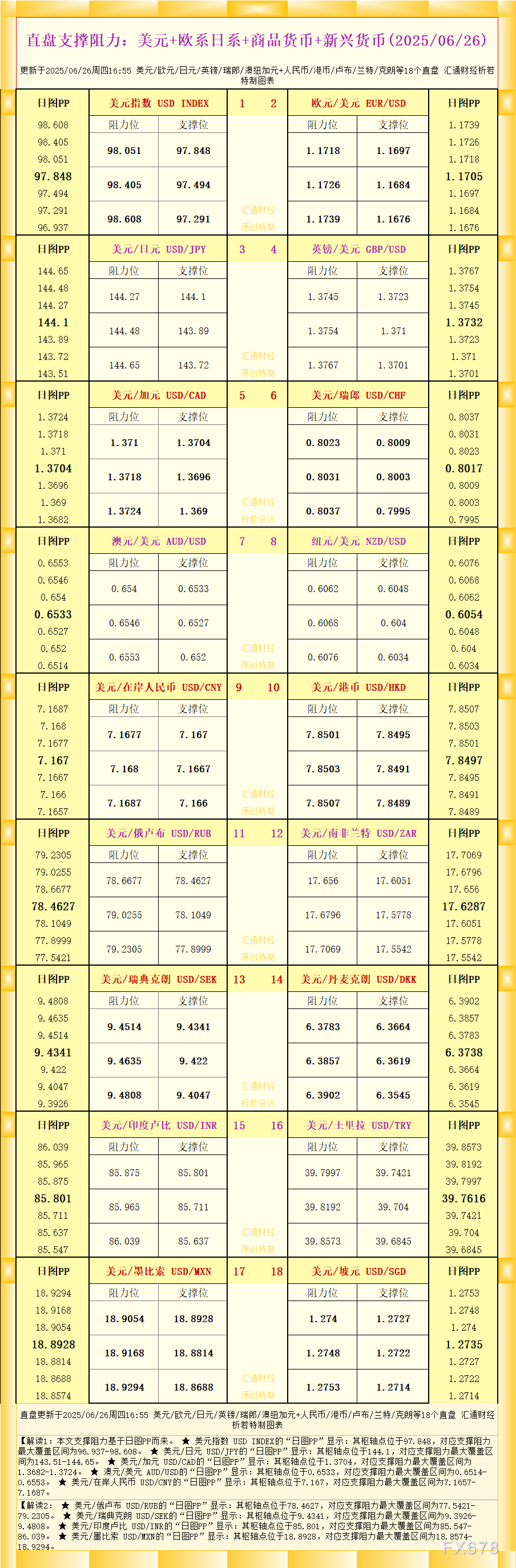 Pepperstone激石——一张图看直盘支撑阻力:美元+欧系日系+商品货币+新兴货币,更新于2025年6月26日周四16:55,具体美元/欧元/日元/英镑/瑞郎/澳纽加元+人民币/港币/卢布/兰特/克朗等18个直盘,更多详见汇通财经析若特制图表中的内容。