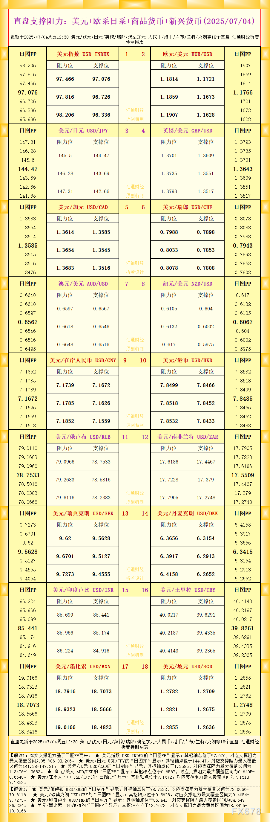 Pepperstone激石——一张图看直盘支撑阻力:美元+欧系日系+商品货币+新兴货币,更新于2025年7月4日周五12:30,具体美元/欧元/日元/英镑/瑞郎/澳纽加元+人民币/港币/卢布/兰特/克朗等18个直盘,更多详见汇通财经析若特制图表中的内容。